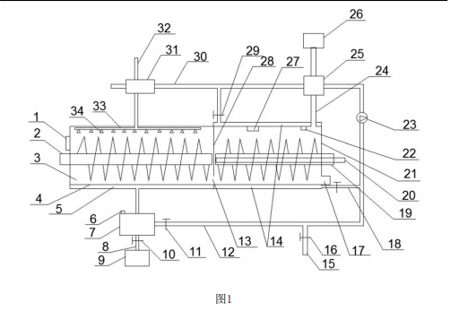 多功能土壤修復(fù)設(shè)備,包括修復(fù)箱,修復(fù)箱內(nèi)設(shè)有隔板,隔板將修復(fù)箱分割成噴淋修 復(fù)室和熱解吸修復(fù)室,修復(fù)箱兩側(cè)的側(cè)壁上分別設(shè)有進(jìn)料口和出料口,噴淋修復(fù)室內(nèi) 設(shè)有第一螺旋輸送機(jī),熱解吸修復(fù)室內(nèi)設(shè)有第二螺旋輸送機(jī),隔板下端設(shè)有通孔;噴 淋修復(fù)室內(nèi)設(shè)有噴淋裝置,噴淋裝置連接有淋洗劑進(jìn)管,噴淋修復(fù)室的底部為濾網(wǎng), 濾網(wǎng)下方設(shè)有集液腔;熱解吸修復(fù)室內(nèi)設(shè)有土壤加熱裝置,頂部連接有廢氣管道;廢 氣管道上設(shè)有第一換熱器,淋洗劑進(jìn)管上設(shè)有第二換熱器,集液腔通過淋洗劑冷管與 第一換熱器的入口連接,第一換熱器的出口通過淋洗劑熱管與第二換熱器的入口連接 。本設(shè)備可同時(shí)去除土壤中的化學(xué)污染物和有機(jī)污染物,并且廢氣熱量可回收利用。