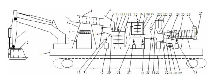 圖中:1履帶式壓路機(jī)、2破碎鏟斗、3挖掘臂、4粉碎機(jī)、5支架、6 控制臺(tái)、7 控制集合柜、8 擋塵板、9 振動(dòng)篩、10 制漿倉(cāng)、11 第一電機(jī)、12 第一攪拌機(jī)、13 第一泥漿泵、14 收集倉(cāng)、15 第二電機(jī)、16 第二攪拌機(jī)、17 淋洗倉(cāng)、18 加熱層、19 保溫層、20第二泥漿泵、21 抽液管、22 濃密機(jī)、23 第一泥漿管、24 出液管、25 泥漿分離機(jī)、26 第三電機(jī)、27 第二泥漿管、28 重金屬處理劑儲(chǔ)存罐、29 第三攪拌機(jī)、30 第四電機(jī)、31 一次沉淀池、32 第一抽液泵、33 二次沉淀池、34 過(guò)濾器、35 第二抽液泵、36 回收儲(chǔ)存罐、37 淋洗液儲(chǔ)存罐、38藥劑柜、39 水劑噴頭、40 水劑存儲(chǔ)罐、41 流量計(jì)、42 第三抽液泵。
